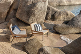 Les différents meubles sont fabriqués principalement à partir de teck décapé et de métal, et sont recouverts de fibres Etwick tressées, ce qui leur garantit un maximum de confort et de durabilité, même dans les endroits les plus froids.