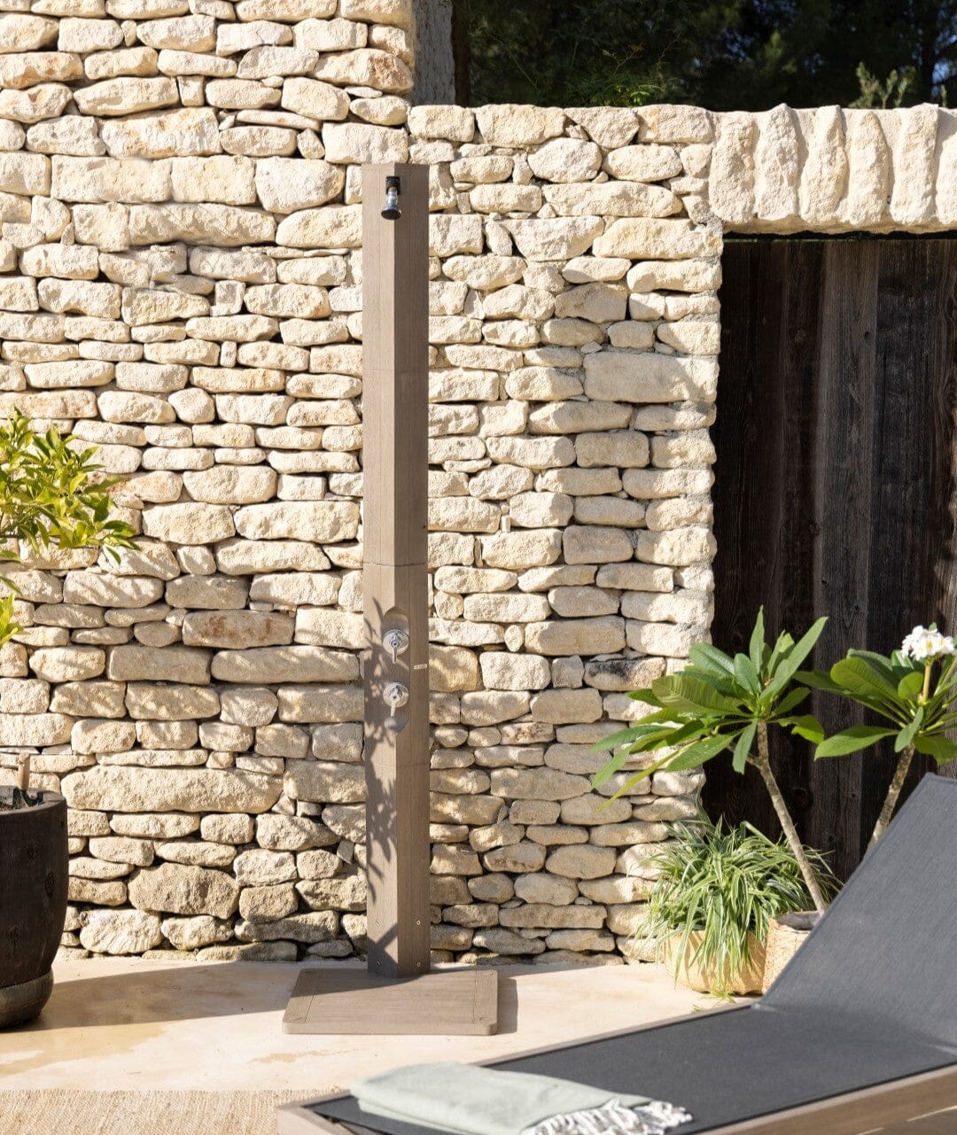 Idéale pour se rincer après la piscine la douche solaire Odalo se branche directement sur votre tuyau d’arrosage et grâce à son réservoir de 25litres vous permet de prendre facilement votre douche. Le kit de robinetterie et le réservoir sont à acheter à part. Robinetterie inox et la structure en teck du produit peuvent rester dehors toute l’année sans entretien particulier.