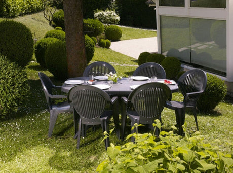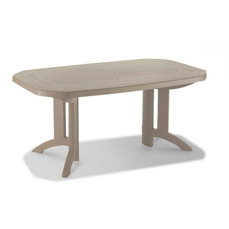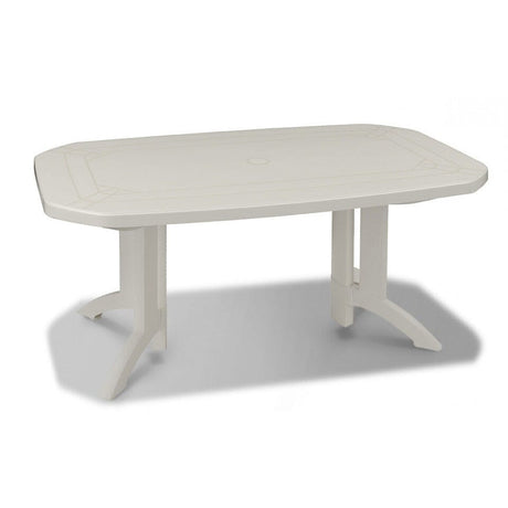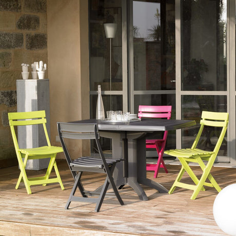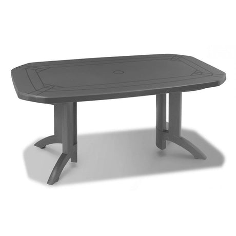 Cette table en résine est idéale pour les petits espaces ou comme table d'appoint. Très pratique par ses 2 côtés repliables, elle ne prend que quelques centimètres d'encombrement une fois rangée. La table de jardin Véga peut même accueillir un parasol en son centre grâce au trou dédié à cet effet.