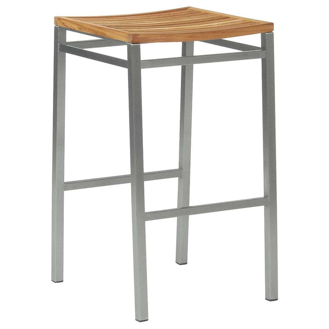 Barlow Tyrie Equinox High Dining Hoher Hocker aus Edelstahl mit Sitzfläche aus Teakholz.