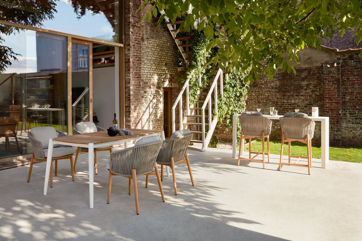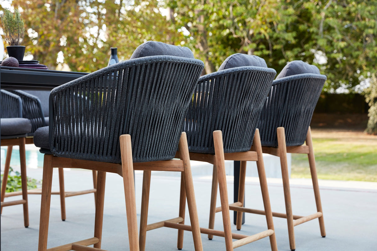 Kollektion. Der Barhocker ist un zeitloser Klassiker mit einem zeitgenössischen Touch, das Ergebnis eines faszinierenden Materialmixes. Gewebte Gurte und Teakholz sorgen in jeder Umgebung für ein warmes und luxuriöses Gefühl.