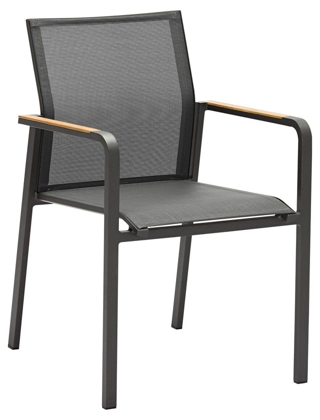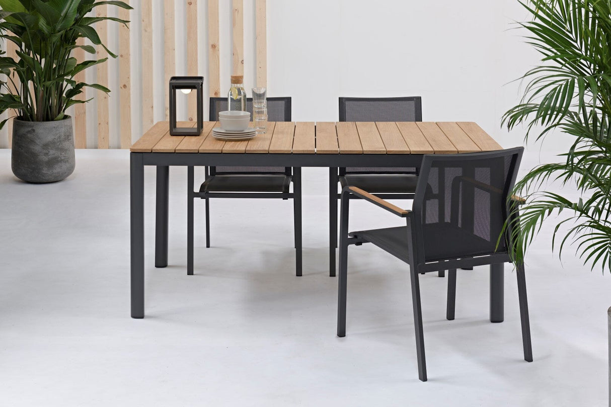 Material: Gestell aus pulverbeschichtetem Aluminium in Graphite aus Aluminium oder zertifiziertem, recyceltem Teakholz (Textilversion Carbon grey)/Armlehnen aus zertifiziertem, recyceltem Teakholz (Textilversion Light grey).