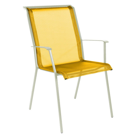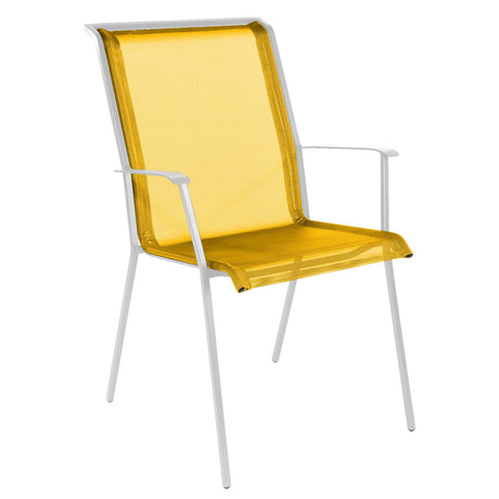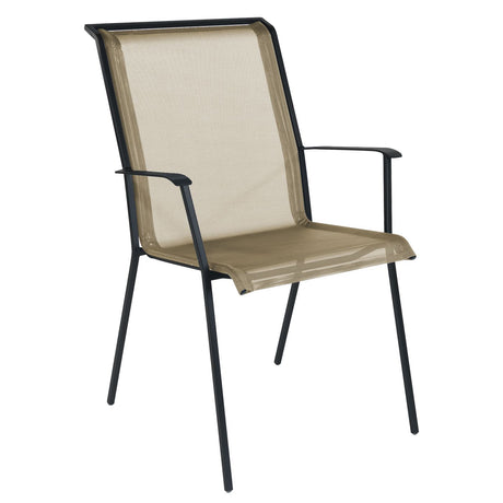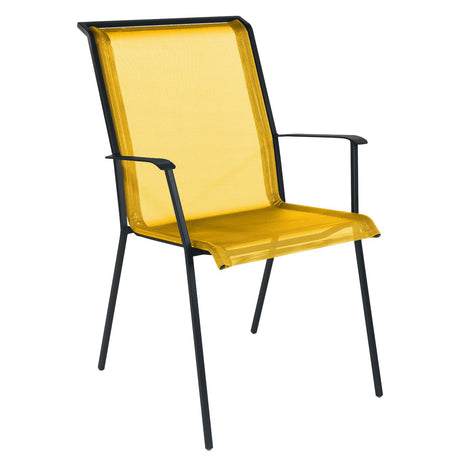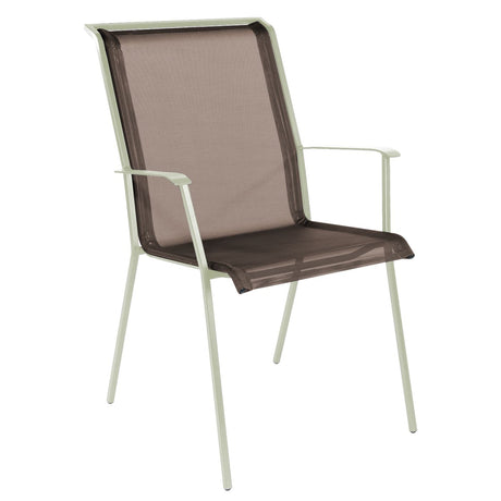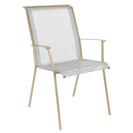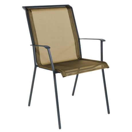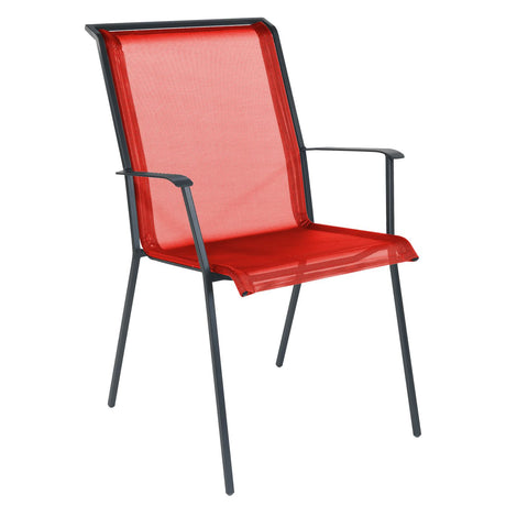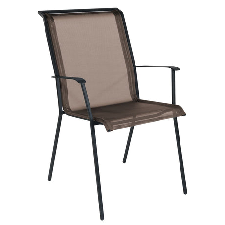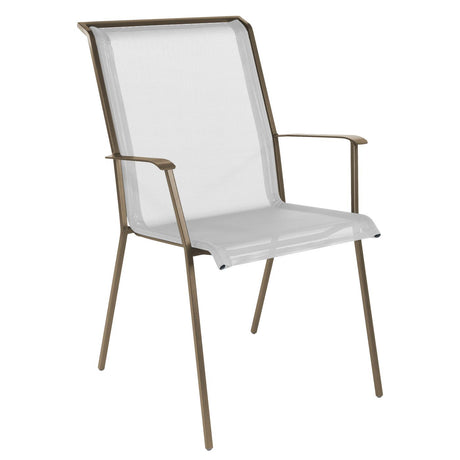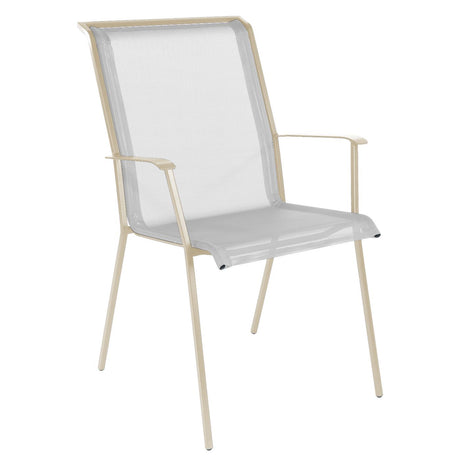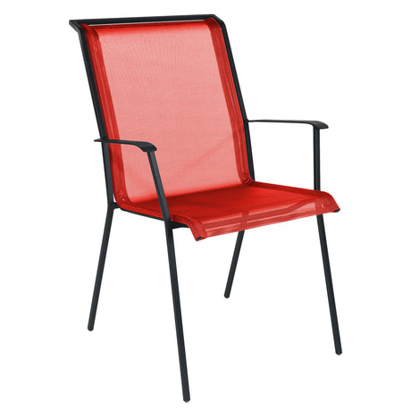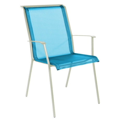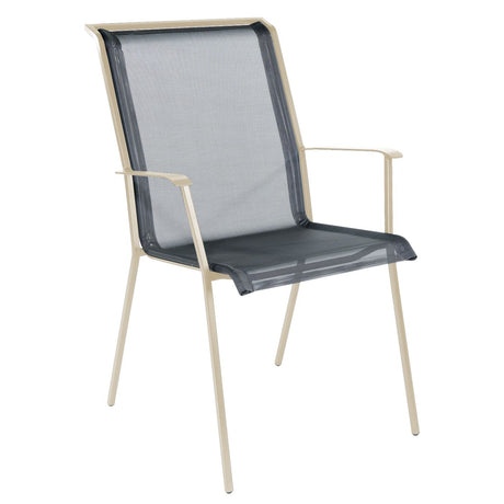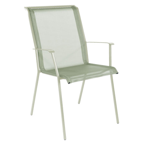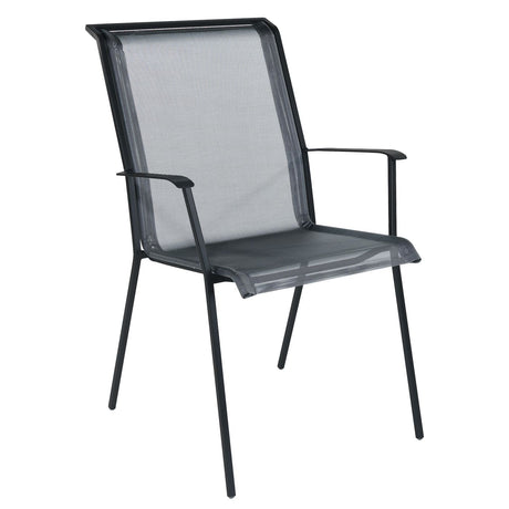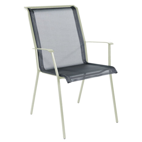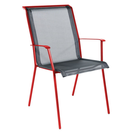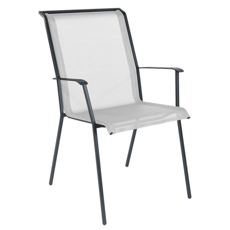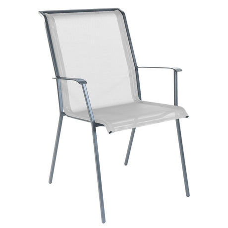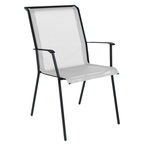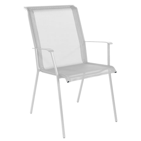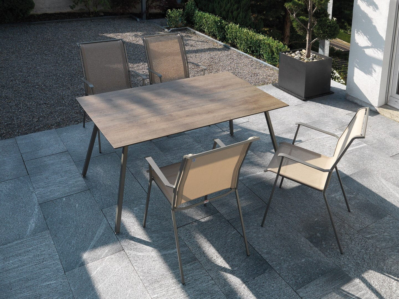 Modern und raffiniert: Das Untergestell mit elegant gespreizten Beinen verleiht Stabilität und Leichtigkeit zugleich . Die nur acht Millimeter dicke Schaffner-Glasfaserplatte scheint zu schweben. Selbstverständlich ist der Tisch witterungsbeständig und eignet sich auch für die Gastronomie. Der passende Stuhl mit hochwertigem „Batyline®“-Bezug ist zudem witterungsbeständig und stapelbar.
