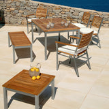 EQUINOX OCCASIONAL-Kollektion. Die aus hochwertigem Edelstahl 316 gefertigte Equinox-Reihe bietet eine perfekte Ergänzung für jeden modernen Wohnraum. Dieser Tisch mit Teakholzplatte verleiht diesem modernen Design ein wärmeres, traditionelleres Aussehen.