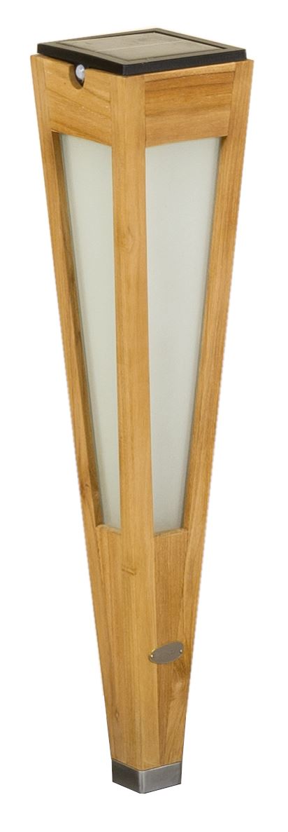 52cm Tecka Solar- und wiederaufladbare Taschenlampe 500 Lumen aus Teakholz und mattem Glas. Ihr schlankes und elegantes Design verleiht ihr eine schlichte und moderne Linie. Sie wird mit Eleganz die Beete, Alleen und Wege Ihrer Außenbereiche beleuchten. Sie ist einfach zu bepflanzen und zu bewegen und die ideale Lösung für eine schicke, nachhaltige und umweltfreundliche Beleuchtung Ihres Gartens. Mit den beiden optional erhältlichen Zubehörteilen kann sie auf einer Terrasse oder als Wandleuchte aufgestellt werden.