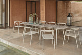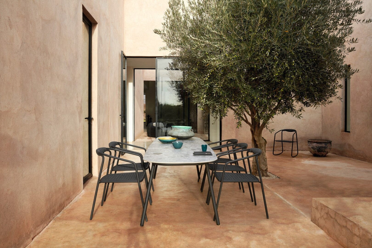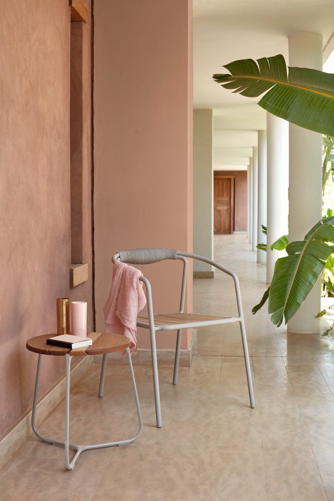 Die luftigen Linien der Sitzmöbelkollektion Duo strahlen Reinheit und Finesse aus. Der Esszimmerstuhl sowie der Duo-Schaukelstuhl bestehen aus zwei gefalteten Aluminiumrahmen, die den Eindruck erwecken, durch Seile verbunden zu sein. Der Schaukelstuhl Duo gewann den Archiproducts Design Award 2018 in der Kategorie „Outdoor“.
