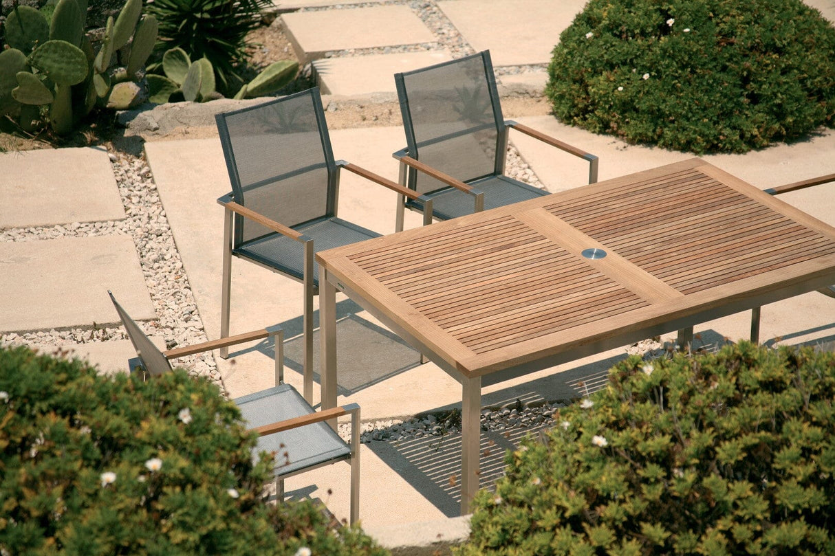 Barlow Tyrie Mercury Dining Sessel aus gebürstetem Edelstahl mit Armlehnen aus Teakholz
