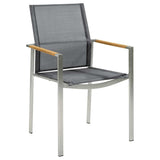 Barlow Tyrie Mercury Dining Esszimmersessel aus gebürstetem Edelstahl, Armlehnen aus Teakholz.