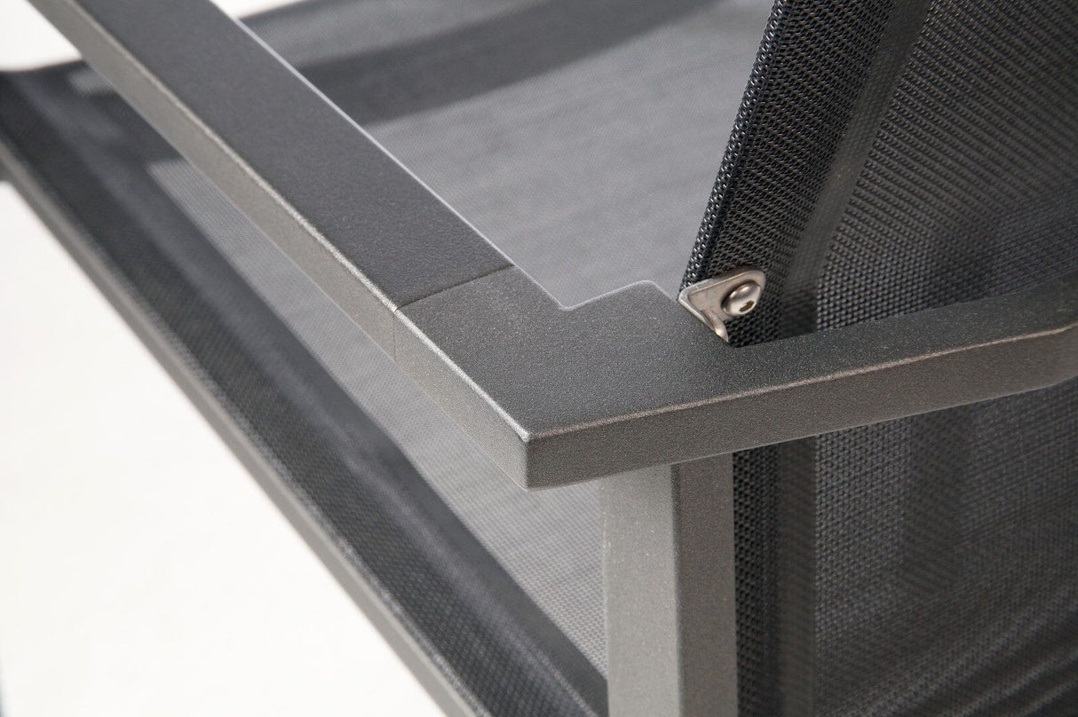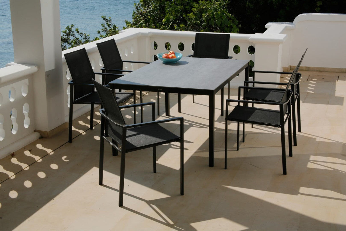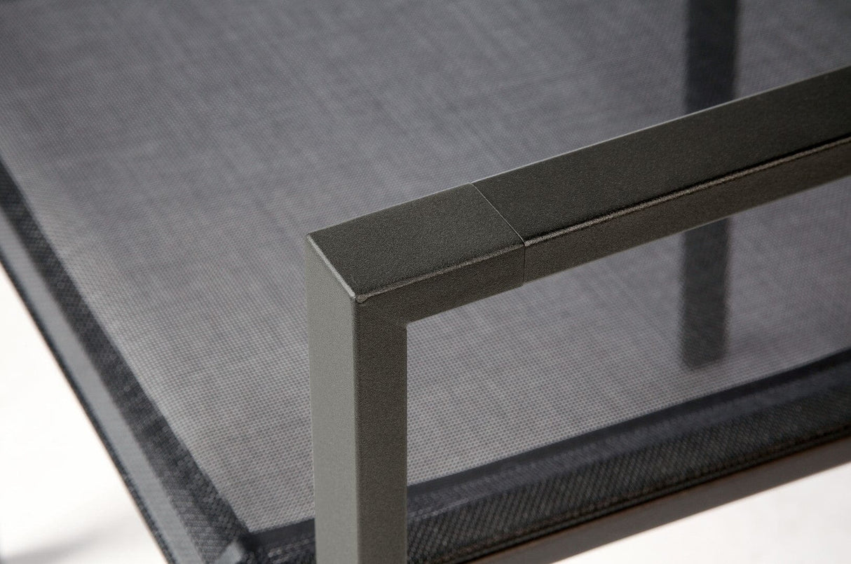 MERCURY DINING-Kollektion. Der Mercury-Sessel aus lackiertem Edelstahl bietet eine höhere Rückenlehne als unsere anderen Stühle und ist mit Federn ausgestattet, um ihn für lange entspannte Nachmittage im Freien äußerst bequem zu machen.