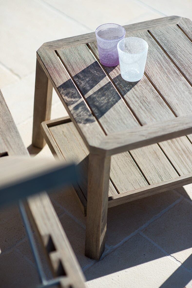 Vielseitige quadratische oder rechteckige Couchtische aus natürlichem oder gestreiftem Teakholz. Die zusätzliche Ebene wird zum praktischen Tablett.