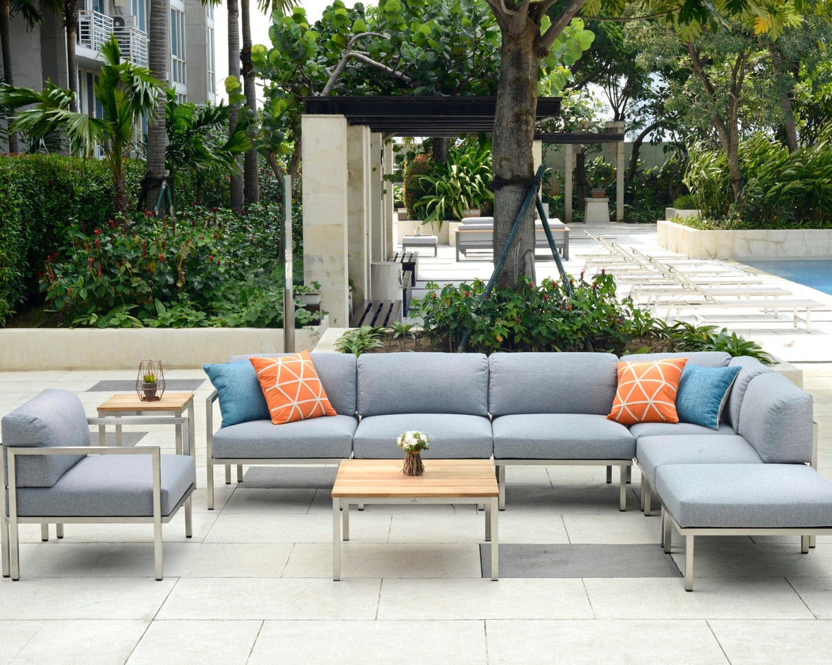 ArollaAngle aus gebürstetem Edelstahl mit Kissen aus wasserfestem Laminatstoff.