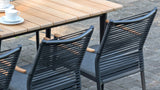 Material: Gestell aus pulverbeschichtetem Aluminium in Graphit / Armlehnen aus zertifiziertem recyceltem Teakholz / Rückenlehne aus anthrazitfarbenem Synthetikseil / Sitz aus anthrazitfarbenem Textil.