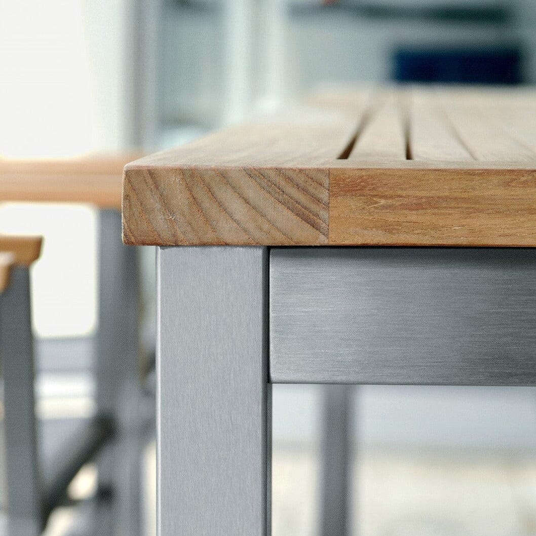 EQUINOX DINING-Kollektion. Eine riesige Auswahl an Esszimmerstühlen und -tischen. Die Equinox-Reihe besteht aus Edelstahl 316 in Marinequalität und ist eine perfekte Ergänzung für jeden modernen Wohnraum. Dieser Tisch verfügt über eine Teakholzplatte, die diesem modernen Design ein wärmeres, traditionelleres Aussehen verleiht.