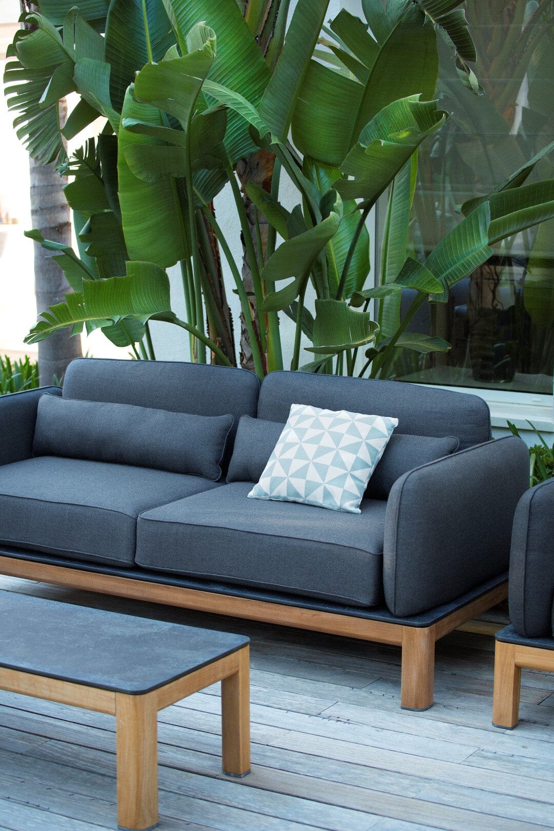 Tekura 200 cm aus Teakholz und schieferfarbenem HPL. Tekura 3-Sitzer-Sofa ohne Plattformen. Das Tekura ist ein Klassiker in der Kollektion Les Jardins und bietet hohen Komfort und eine Oberfläche, die fast vollständig aus Kissen besteht. Das Gestell ist nicht sichtbar, da die Kissen es vollständig umschließen. Das Gestell kann zu jeder Jahreszeit draußen bleiben, aber wir empfehlen Ihnen, die Kissen zu verstauen oder die Schutzhülle (optional) anzuziehen.