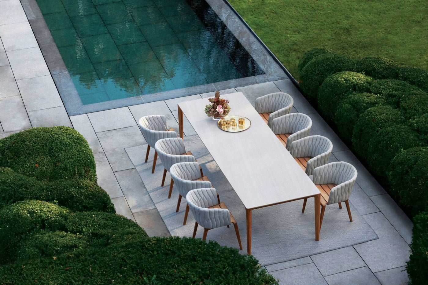 Pur und raffiniert, das sind die beiden Eigenschaften, die die Tischkollektion U-nite von Royal Botania am besten beschreiben. Bei der Variante aus beschichtetem Aluminium wird die Tischplatte in das Gestell eingelegt, sodass nur die Oberfläche der Tischplatte sichtbar ist.
