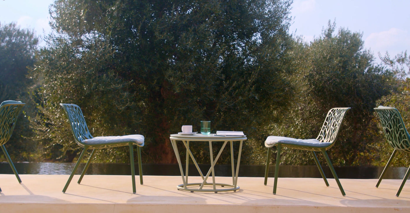 Ein Name, der an Savanne und unberührte Natur erinnert: Die Struktur der Wild erinnert an die Muster von ineinander verschlungenen Ästen inmitten eines dichten Waldes. Diese Kollektion von Esstischen, Couchtischen und Hockern bewahrt eine große formale und stilistische Kohärenz und verleiht jedem Raum einen exotischen Touch. Das lackierte Aluminium macht diese Tische und Hocker widerstandsfähig gegen Wind, Regen und Ausbleichen durch die Sonne.
