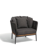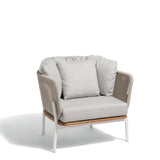 OMER-Sammlung. Omer garantiert unbegrenztes Outdoor-Erlebnis mit bequemen und dennoch funktionellen wasserdichten Kissensets. Zarte Seildetails und ein eleganter runder Rahmen in Lava oder Weiß sorgen für einen femininen Look. Der Loungesessel passt dank seiner Teakholzelemente, die ihm eine warme und natürliche Note verleihen, perfekt zur Kollektion.