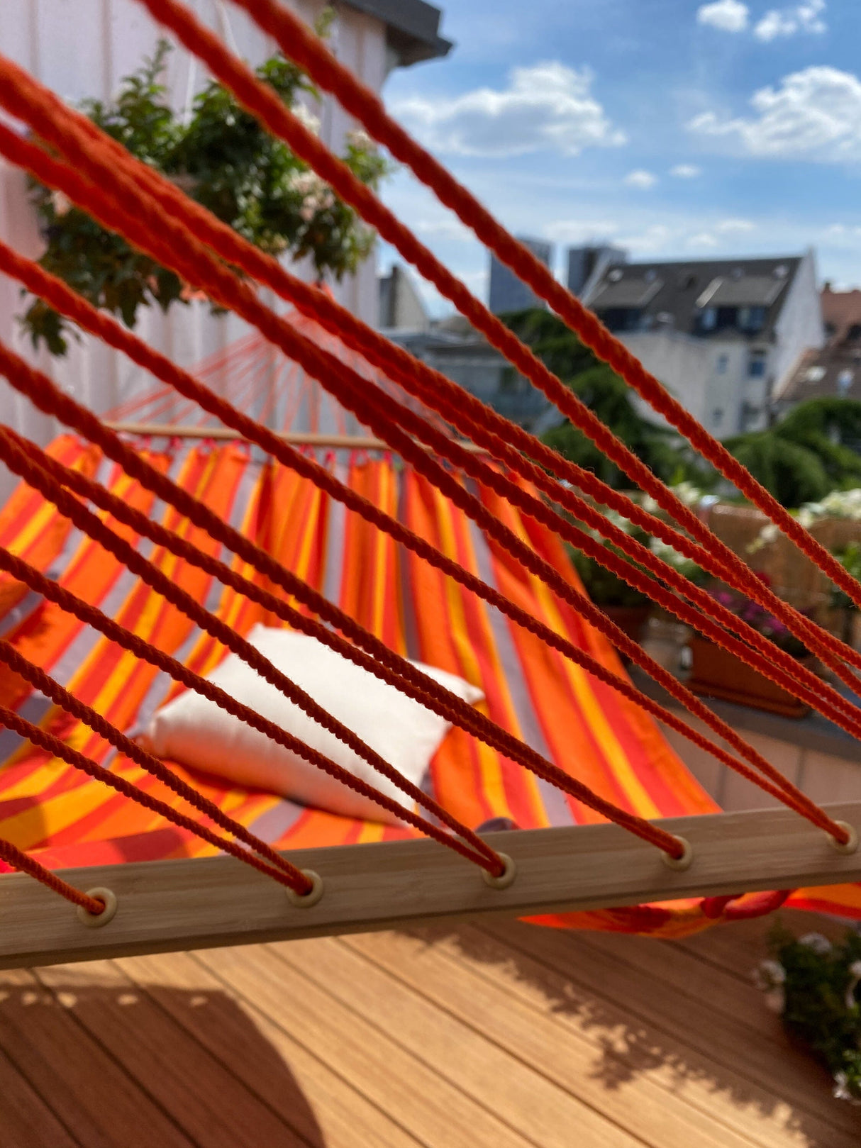 Mit ihrem 160 cm breiten Stoff vereint sie den außergewöhnlichen Komfort der klassischen Hängematte mit dem dekorativen Aspekt der Hängematte mit Stangen. Sehr komfortabel für 1 bis 2 Personen.