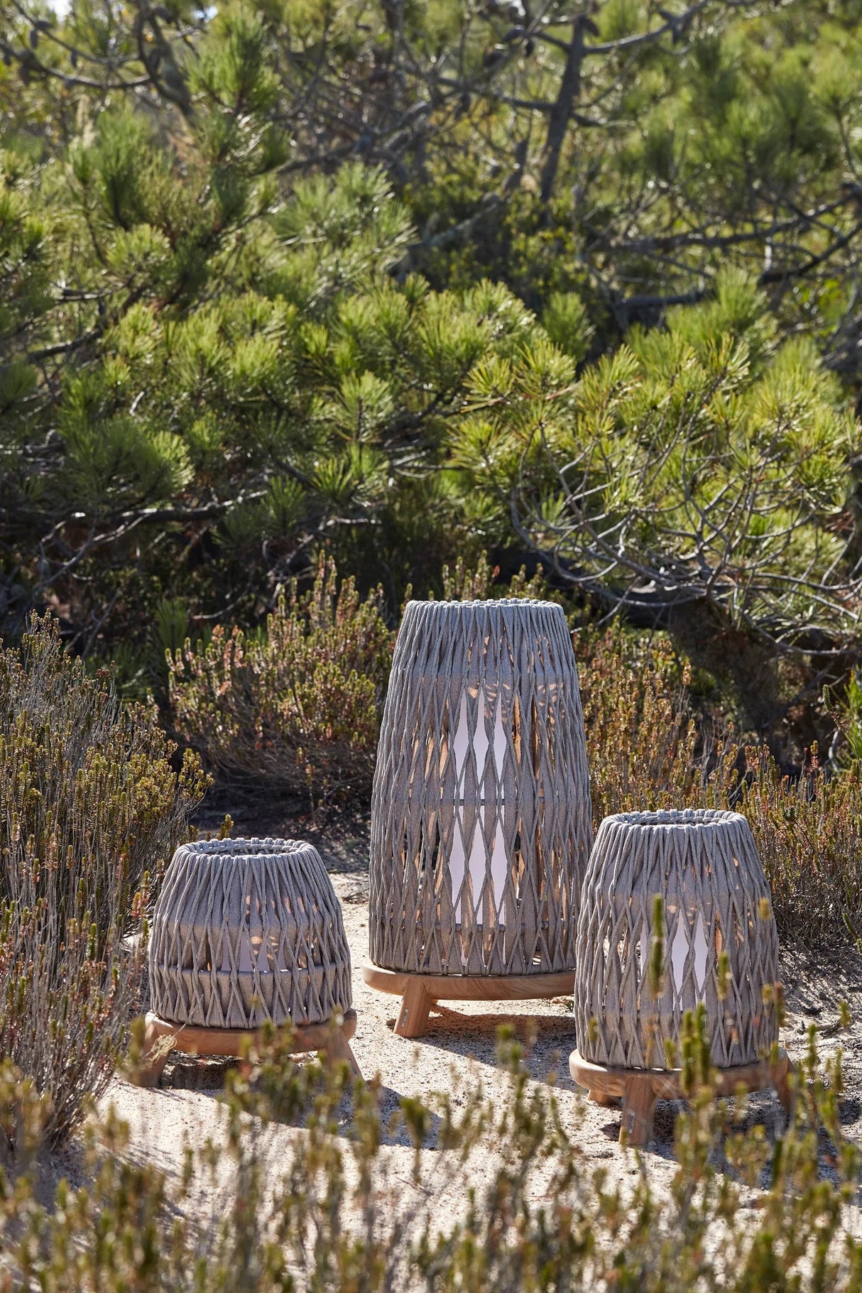 Der organisch geformte, gewebte Lampenschirm ist von einem geschnitzten Holzsockel umgeben. Unter Verwendung nicht nur eines, sondern zweier Materialien hat der Designer einen einzigartigen und dennoch modernen Ansatz für traditionelle Webtechniken entwickelt, um ästhetisch ansprechende Produkte zu schaffen, die Sie verführen und Ihre Sommerabende erhellen werden.