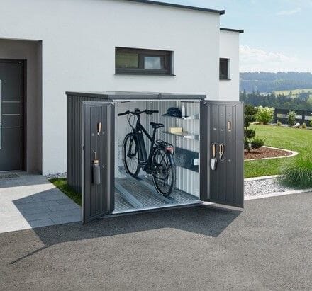 Multifunctional space saver without a license, ideal for storing 2 bicycles, garden tools or garden furniture. The intelligent rail system (optional) makes it easy to adjust the bike: place the rear wheel on the floor rail, hook the bike handlebar into the extendable upper rail, slide it in, and that's it! The sliding shelf system with 2 shelves (length 150 cm) provides valuable services for storing garden tools.