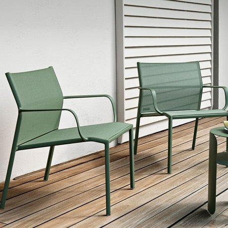The Cadiz collection, designed by Antoine Lesur , offers a generous range of seats with a contemporary look. The combination of aluminum and TTE (Outdoor Textile Fabric), popularized by Fermob over 22 years ago, is making a strong comeback, providing both comfort and resistance for outdoor use, even in harsh weather conditions (seaside).