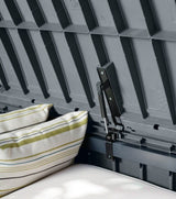 The Glenwood storage chest is extremely sturdy, stylish and seats two adults (Max 240kg). It is made from a durable, weather-resistant material, which impresses with its superb wood look. The trunk offers 390 liters of storage space. It also has an automatic opening mechanism, making it easy to open, even with full hands.
