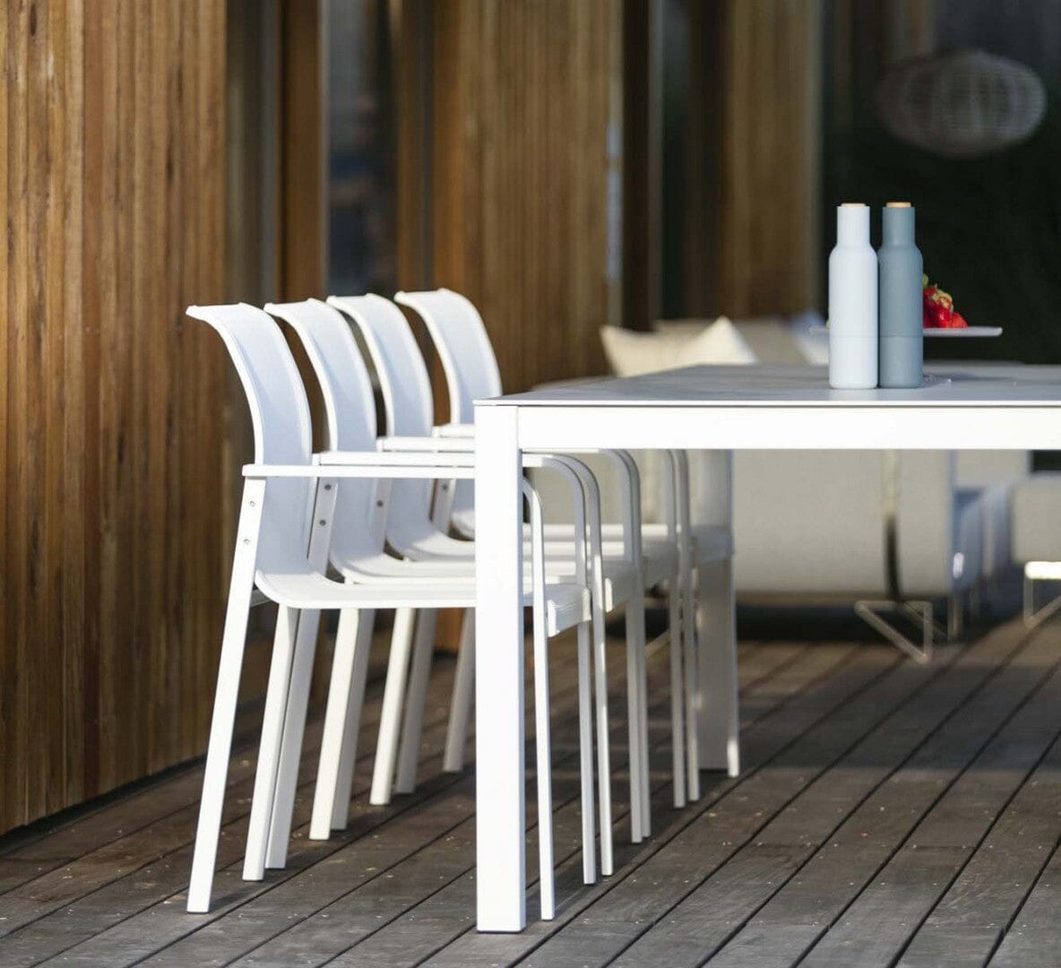 The armchair combines a fresh design and a perfect finish and the tables offer you a clear and clean design.