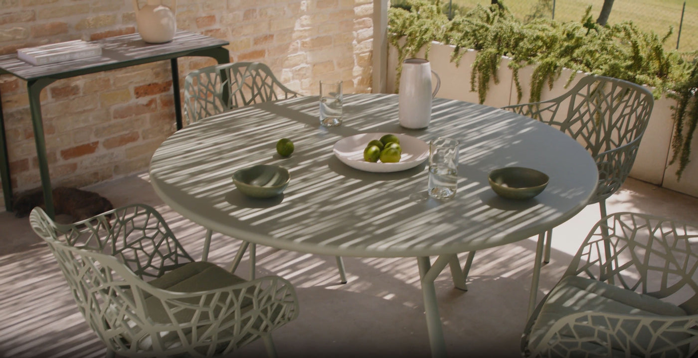 The characteristic shape of the legs of this aluminium outdoor table is inspired by the mathematical symbol of the square root (Radice Quadra in Italian). The structure, light and geometric, in die-cast aluminium, is completed by a square, rectangular or round top in aluminium or speckled aluminium. The Radice Quadra tables match all the seats in the Fast collection, but a particularly refined contrast is obtained by combining them with the graphic style of the Forest collection.