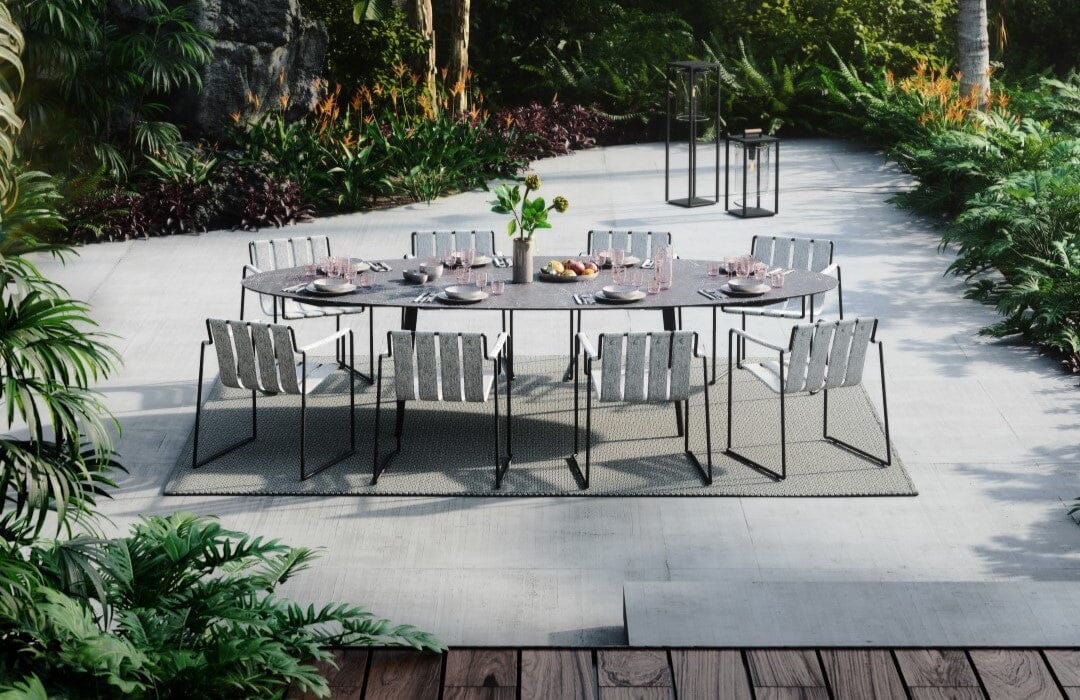 The new and highly original Strappy range features a varnished stainless steel structure comprising a continuous rod all around forming a minimalist but functional and stackable frame, on which the padded seat straps and armrests are fixed. They seem to be suspended inside this elegant frame.