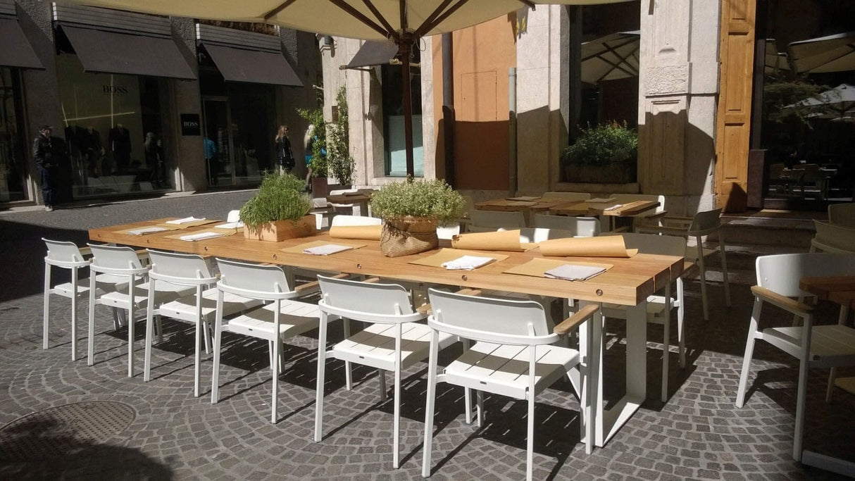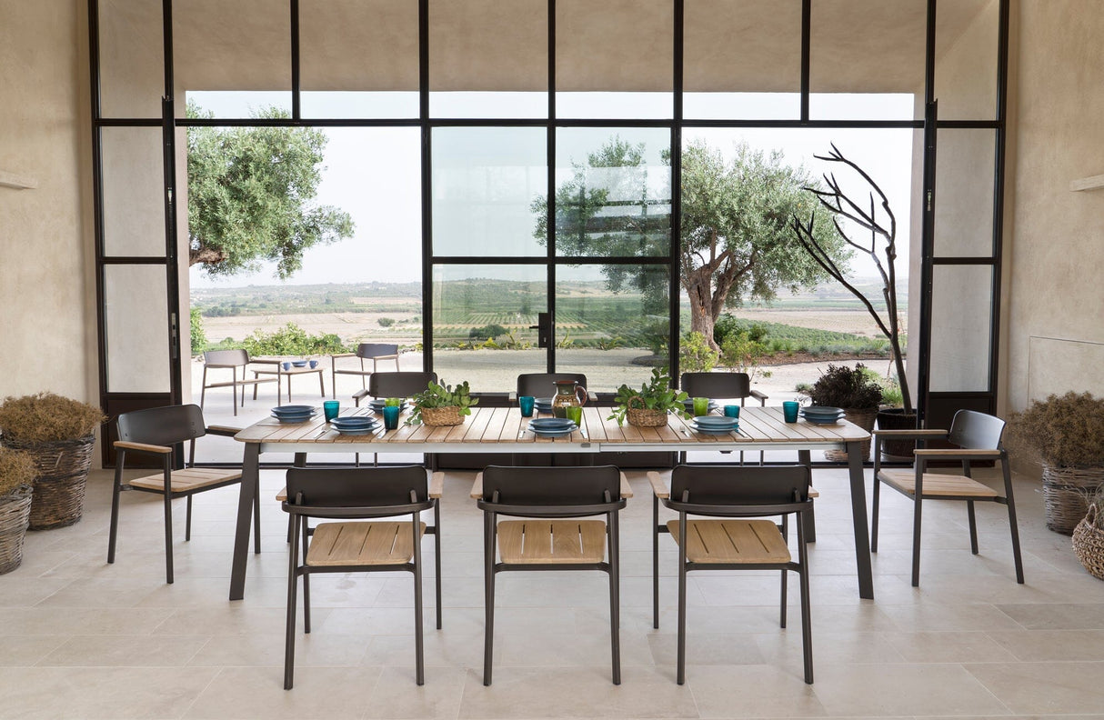 Shine collection. The Shine collection by Arik Levy is a collection with modern and clean lines, suitable for both residential and contract use. The marriage between aluminum and the frank and decided design conveys a sensation of both lightness and essential comfort. Armchairs, chairs and low chairs, stackable and equipped with teak armrests, are also available in an interesting combination between aluminum structure and 100% FSC teak seat. For furnishing dining and relaxation areas, the Shine collection also includes tables, high tables and stools, the latter also offered in the alternative version with teak seat. The sun lounger, the daybed and a two-seater sofa complete the collection.