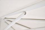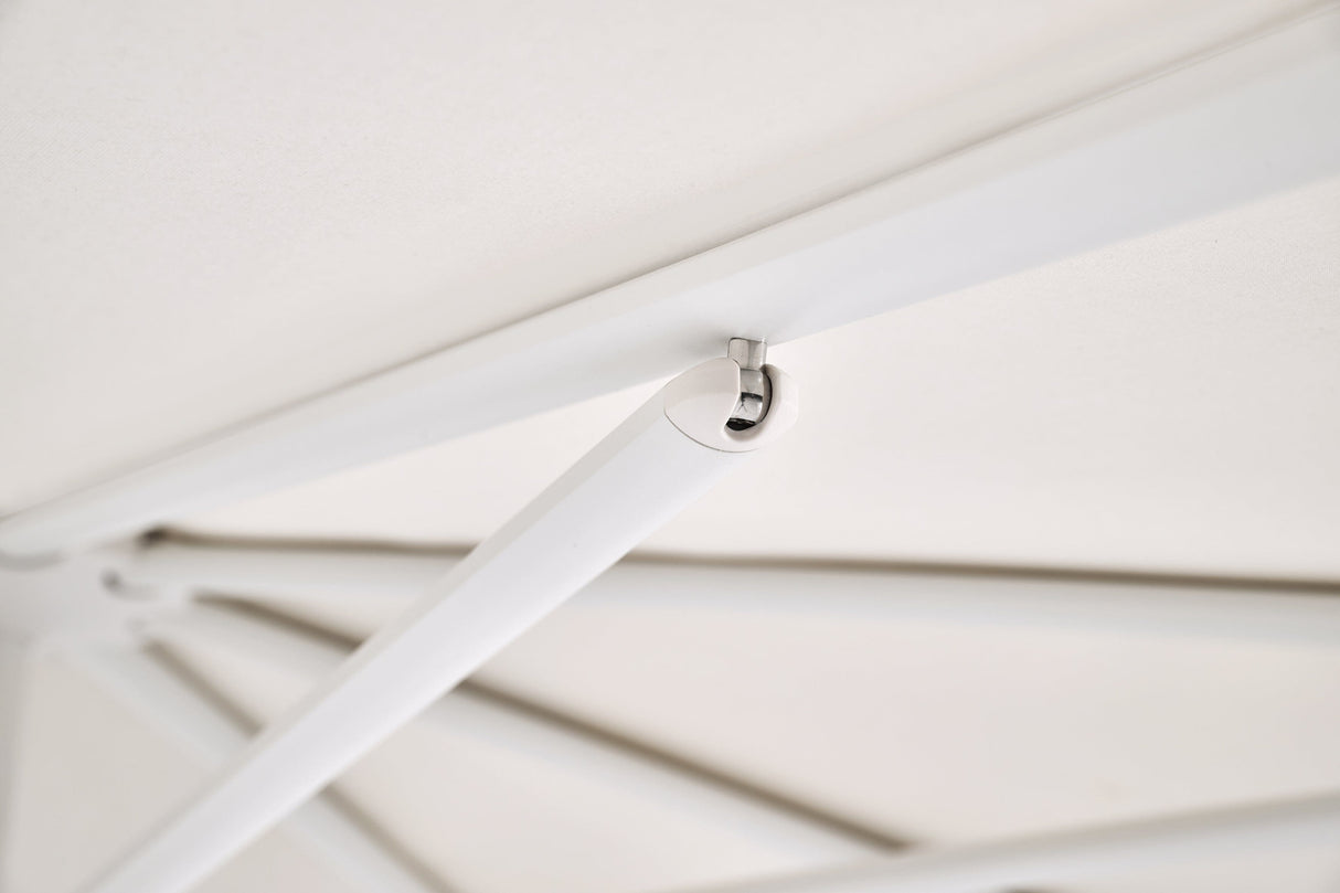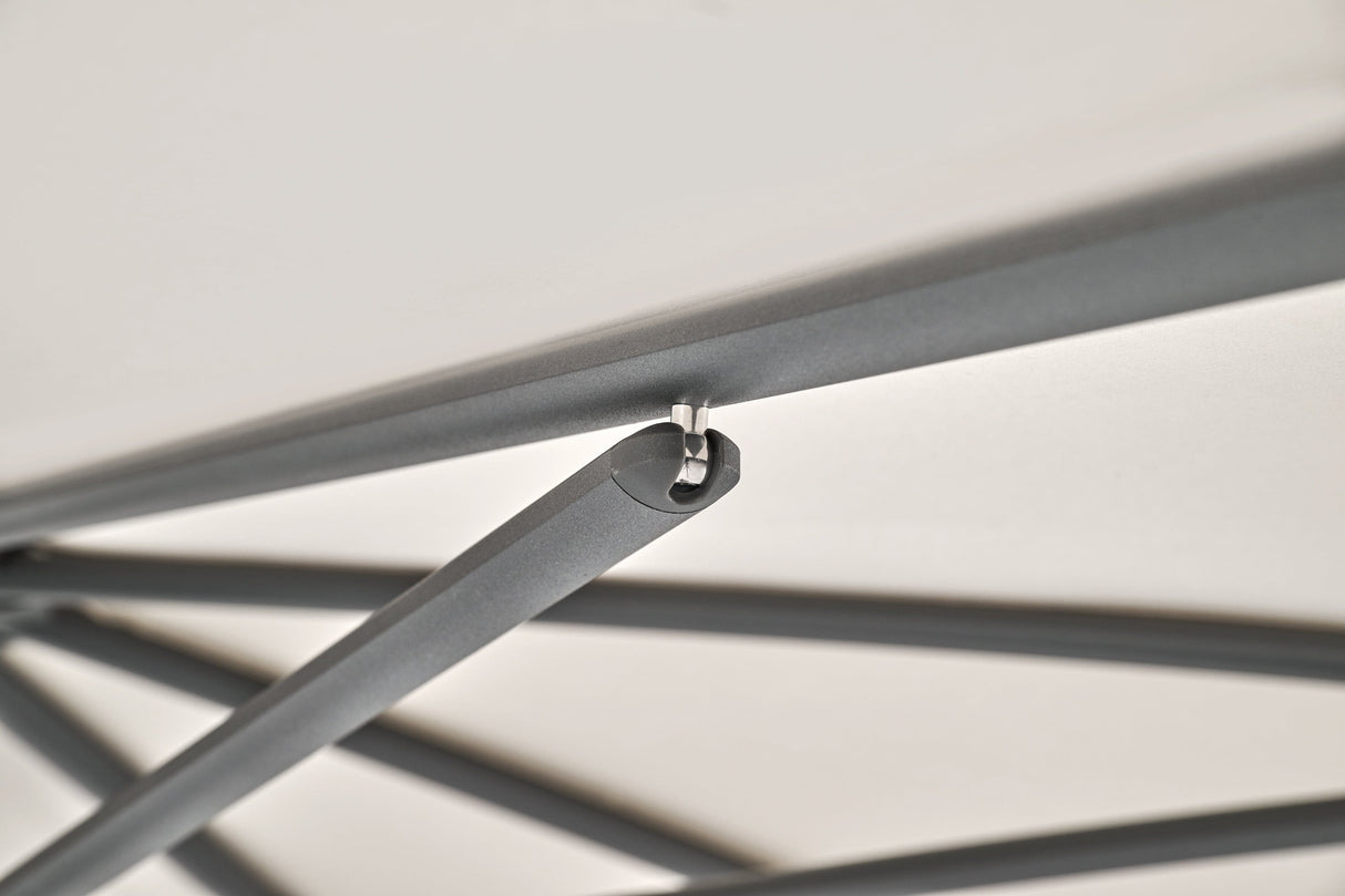 The flat ribs with refined joints, combined with the white or anthracite powder-coated aluminum profile, give the parasol roof a modern, floating appearance. The mechanical centerpiece is the technology ingeniously hidden in the intelligent slide. When pushed upwards, the parasol opens manually in the blink of an eye. Its height adjustment via rotary knob is continuous up to 50 cm. Thanks to the tilt ball joint, the parasol roof tilts up to 32° to the left or right in no time at all. Thanks to the interior fixing tube, the parasol appears to be one with the base. Technical advancement can be as beautiful as a love of design.