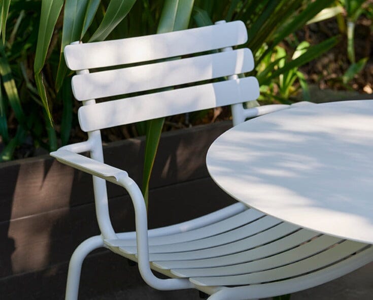 ALUA is a versatile aluminum dining chair designed for a variety of settings, from a private balcony to a public park or restaurant. The chair is modeled after the HOUE ReCLIPS dining chair and requires minimal maintenance.
