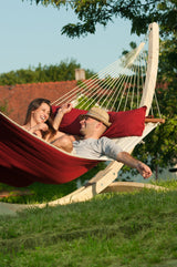 Kingsize hammock with spreader bars, for extra-wide comfort. Tip: remember to always tighten your hammock when you hang it!