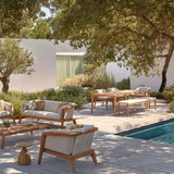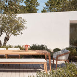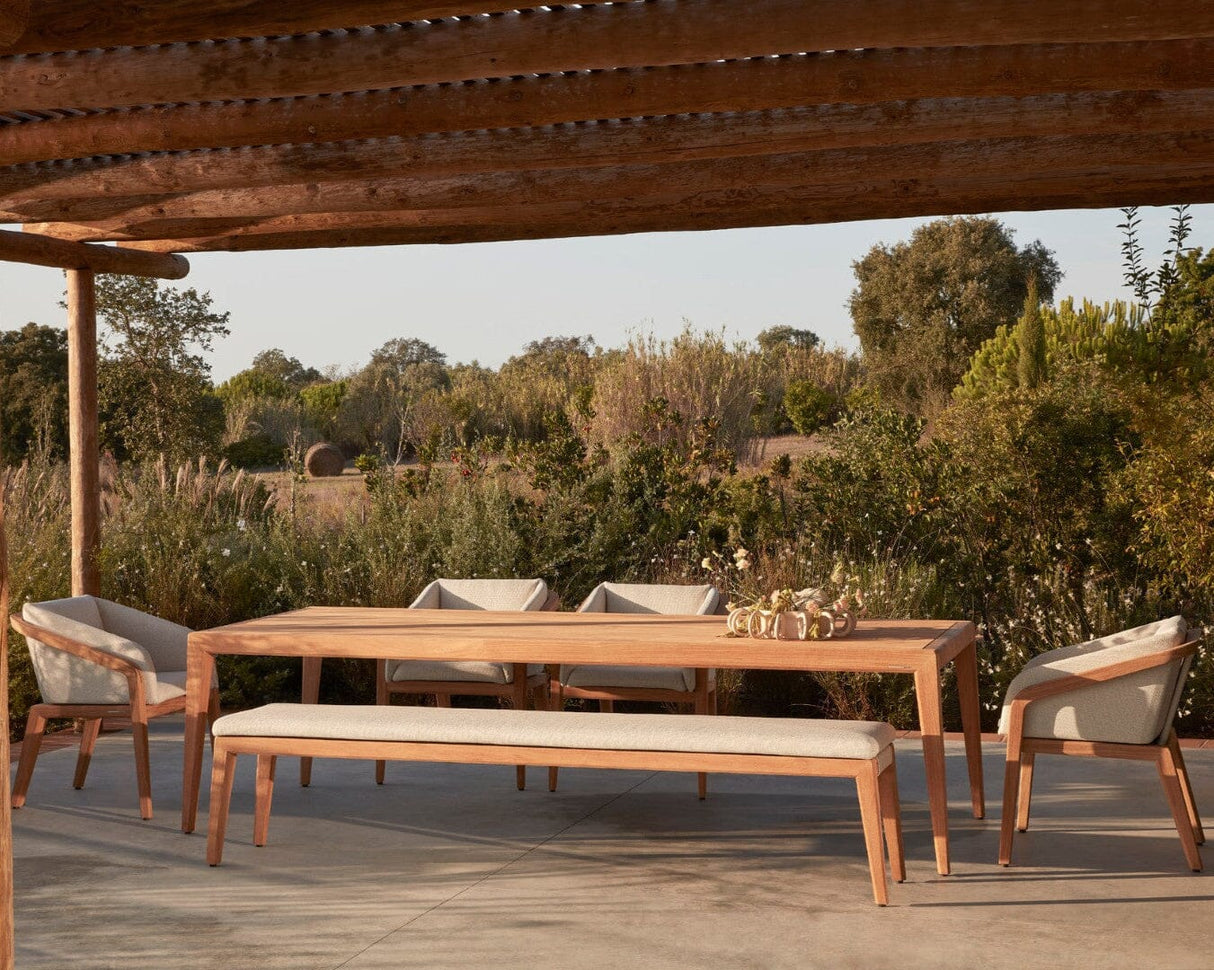 Clean lines and pronounced curves give Sunrise an undeniably captivating stance, while the warmth of the materials and openness of the setting irresistibly invite endless moments of outdoor enjoyment. Available in warm brushed teak or bold scuro teak, Sunrise offers a comprehensive range of lounge and dining furniture. Dark teak details and a backrest upholstered in fabric or batyline® complete the design of this robust yet elegant teak collection by Matthew Townsend. From the country estate to the avant-garde hotel to the futuristic yacht: Sunrise is a versatile collection that will add a captivating touch to any environment.