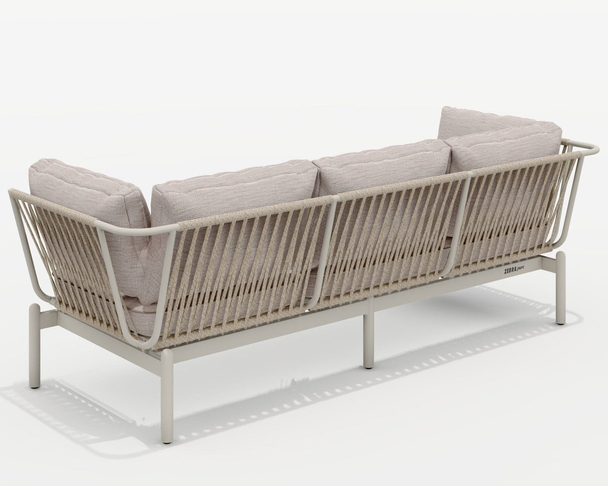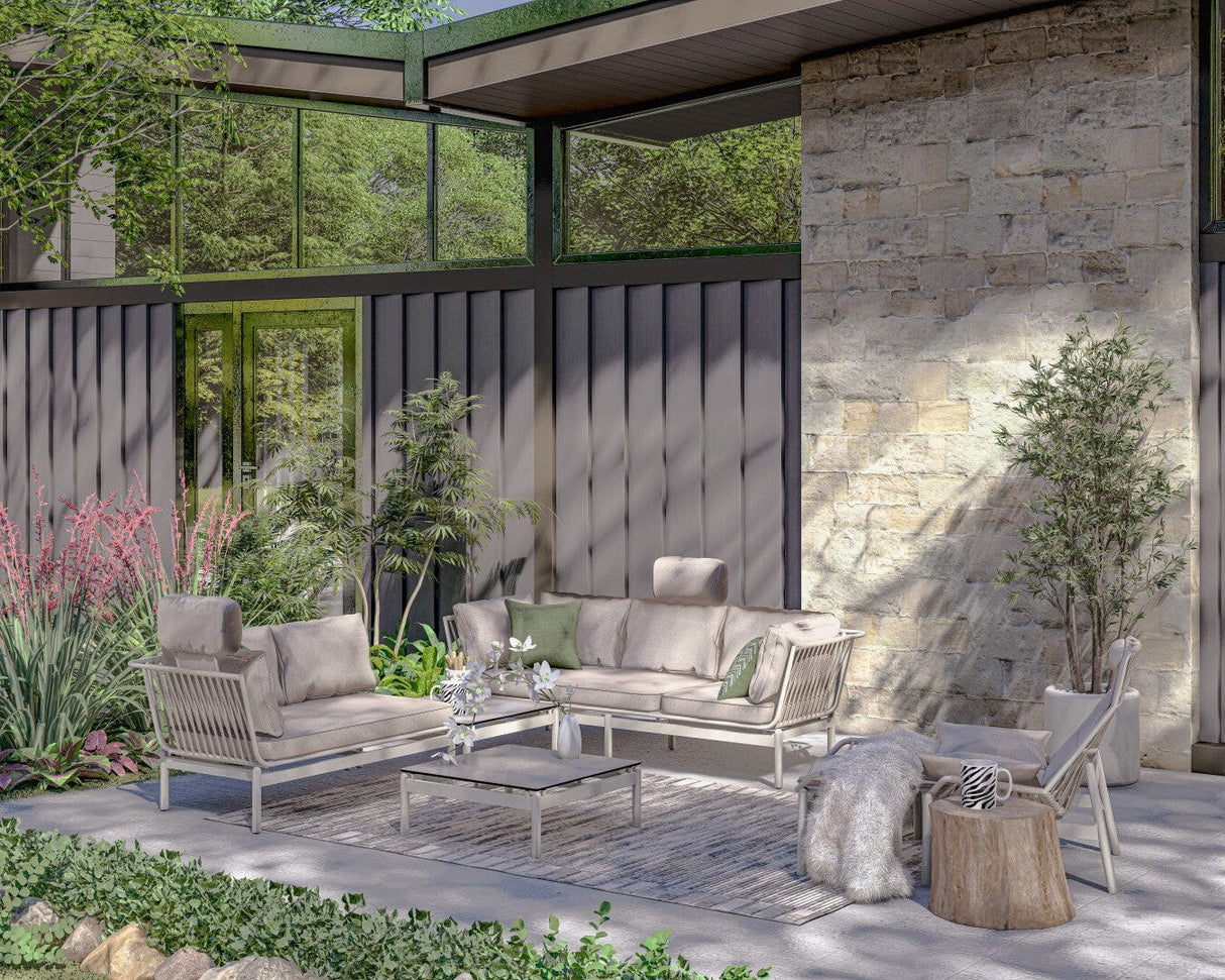 Materials: Light Taupe Aluminum / Cream Weatherproof Cushions / Sahara Rope.