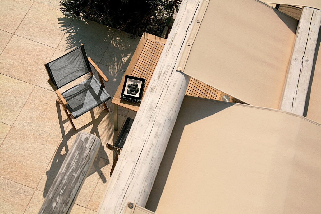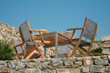 Collection HORIZON. C'est l'un de nos fauteuils pliants très populaires avec des raccords affleurants en acier inoxydable et des élingues en Textilene®. Il y a un mécanisme pour verrouiller le fauteuil en position ouverte et le fauteuil se plie en soulevant le siège.