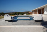 Collection LAYOUT DEEP SEATING. La collection comprend deux tailles d'assise rembourrée et cinq tables, qui, ensemble, permettent des groupes de sièges intimes ou grandioses. Les dossiers et les accoudoirs rembourrés sont des composants séparés et peuvent s'adapter à n'importe quel côté des sièges pour créer des canapés, des canapés d'angle, des chaises longues, des chaises, des poufs et de nombreuses configurations asymétriques. Les sièges rembourrés et les tables en teck utilisent un cadre raffiné en acier inoxydable 316 de qualité marine qui est enduit de poudre dans un choix de deux couleurs.