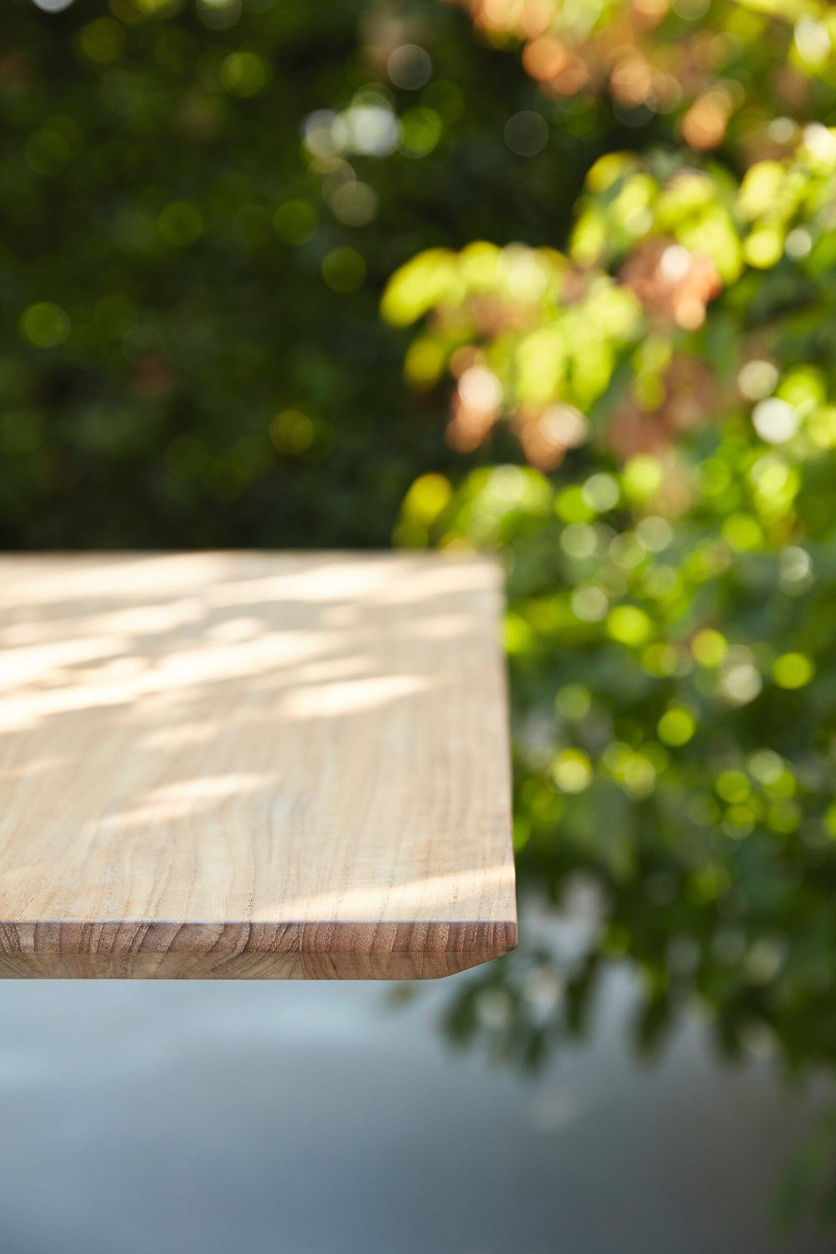 Le bois de teck change d'aspect à l'extérieur. A entretenir pour garder sa teinte d'origine ou à laisser se patiner et griser naturellement.