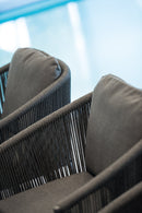 Collection OMER. Omer garanti une expérience de plein air illimitée avec des ensembles de coussins imperméables confortables mais fonctionnels. Des détails délicats en corde et une élégante monture ronde en coloris lava ou en blanc fusionnent pour créer un look féminin. Le fauteuil repas est parfaitement assorti à la collection grâce à ses éléments en teck qui donnent une touche chaleureuse et naturelle.