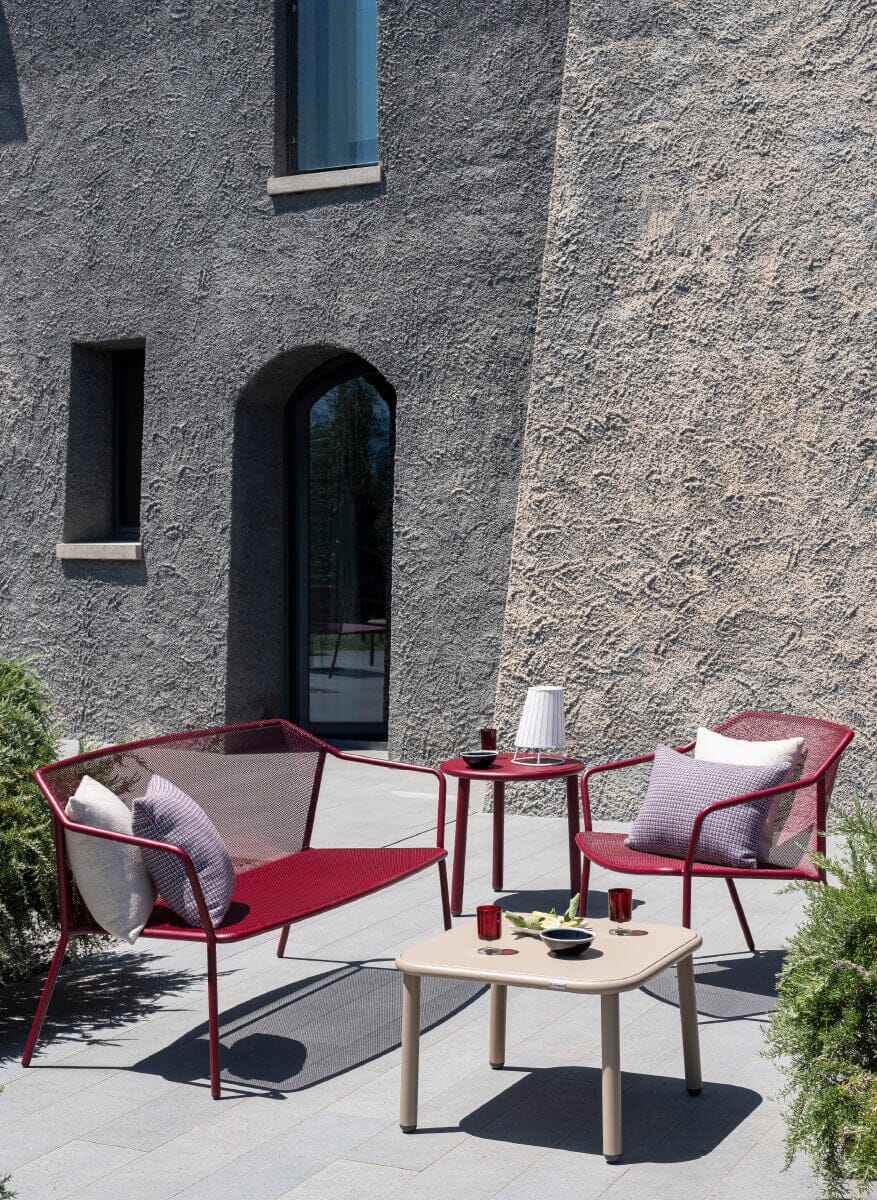 Collection DARWIN. Les proportions ergonomiques et la légèreté des lignes de sa structure sont synonymes de confort et adaptabilité. Darwin est une collection en acier qui évoque les thèmes classiques, à travers une délicate trame de tôle insérée dans une structure géométrique contemporaine. L’effet de la texture de l’assise et du dossier est l’élément distinctif du style de cette collection, qui se mêle bien avec les lignes de la structure.