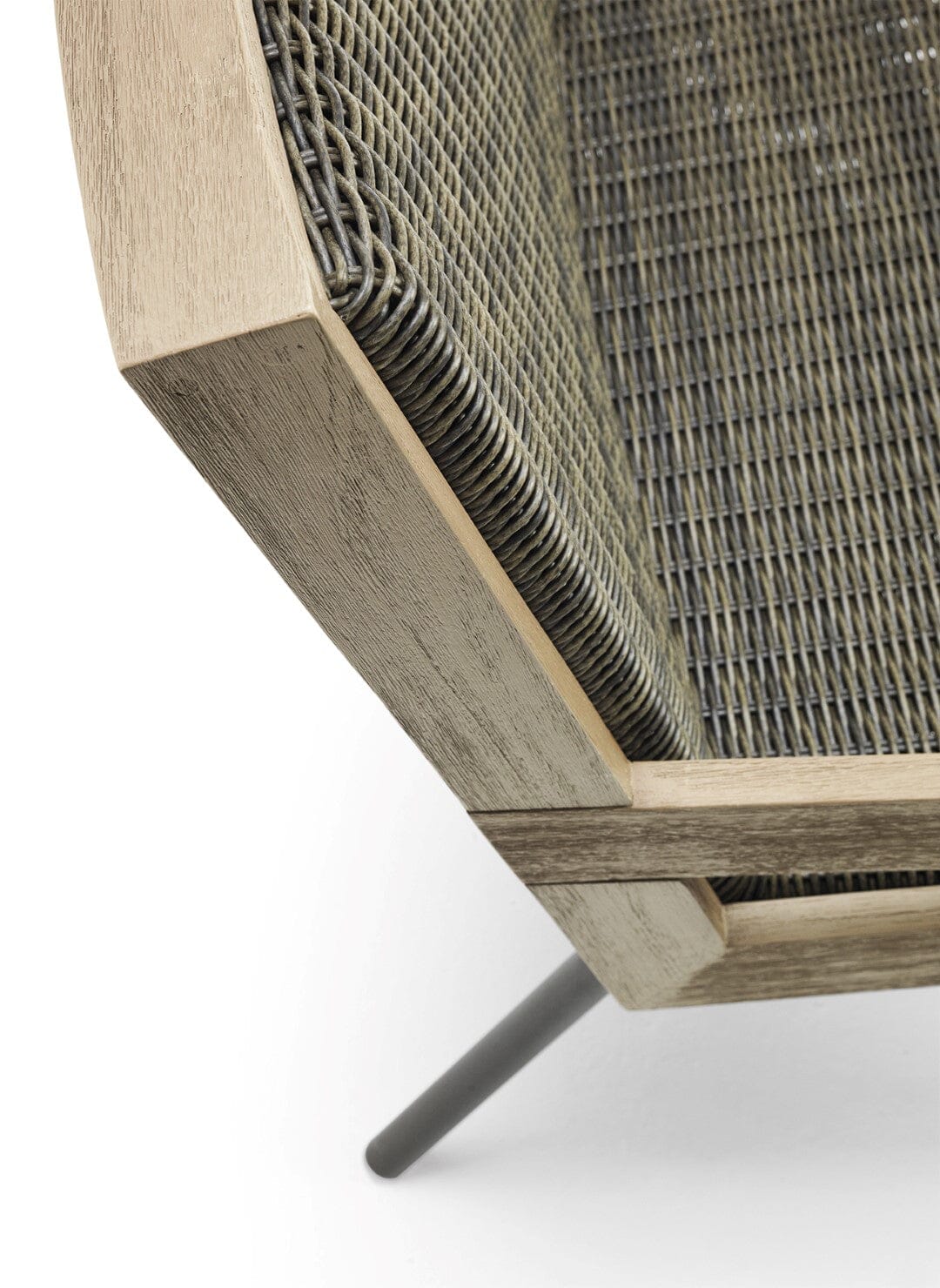 Les différents meubles sont fabriqués principalement à partir de teck décapé et de métal, et sont recouverts de fibres Etwick tressées, ce qui leur garantit un maximum de confort et de durabilité, même dans les endroits les plus froids.