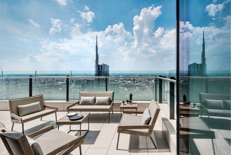 Les différents meubles sont fabriqués principalement à partir de teck décapé et de métal, et sont recouverts de fibres Etwick tressées, ce qui leur garantit un maximum de confort et de durabilité, même dans les endroits les plus froids.