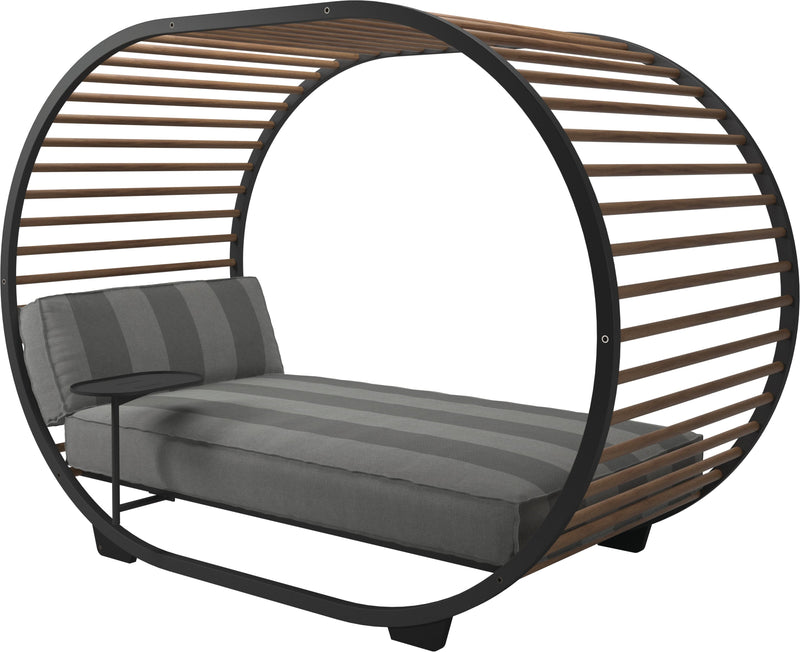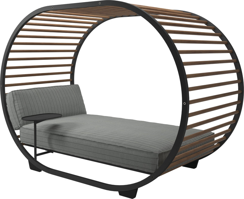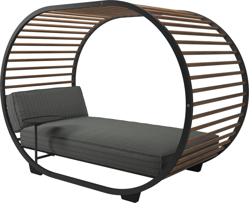 Collection CRADLE de Gloster. Il s'agit de créer des pièces définies. Votre propre oasis privée en extérieur, mais toujours ouverte et exposée aux éléments avec un sensation d'enclos. Luxueux pour un, mais assez grand pour deux, avec une sélection de nuances, la vie privée peut être ajustée. Une variété de finitions et de tissus ainsi qu'une table basse intégrée vous permettent de créer votre propre havre.