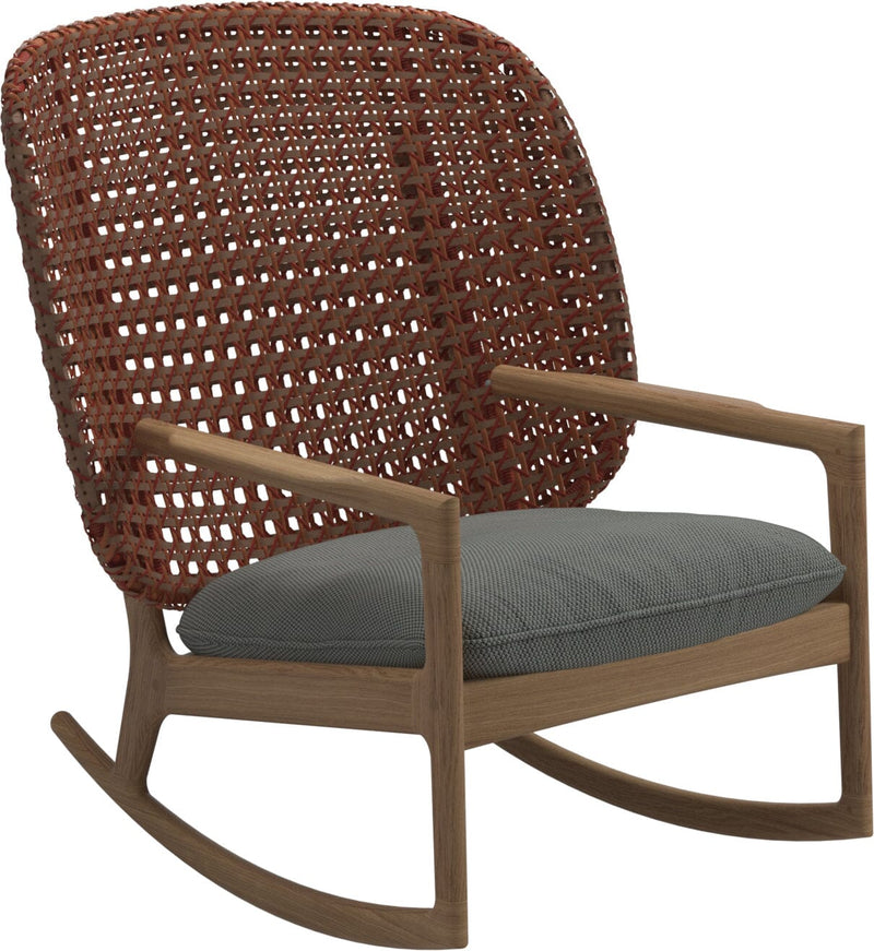 Collection KAY de Gloster. Le dossier est incontestablement la définition de la gamme KAY. Délibérément surdimensionné et magnifiquement incurvé, KAY vous étreint pendant que vous êtes assis offrant confort et abri. Disponible en Brindle, Harvest ou Copper style "cane française" en osier résistant aux intempéries combiné à un cadre délicat en teck. Les lignes de KAY combinent un style intemporel à un confort pratique.
