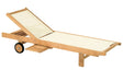 Bain de soleil Azur et teck et toile batyline écrue. Le bain de soleil Azur c'est un modèle confortable et équipé: une toile batyline très résistante, des roues arrières, pour des déplacements en toute simplicité, un dossier réglable pour un confort personnalisé et une tablette escamotable vous permettant de garder tous vos effets personnels à portée de main.