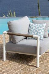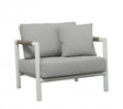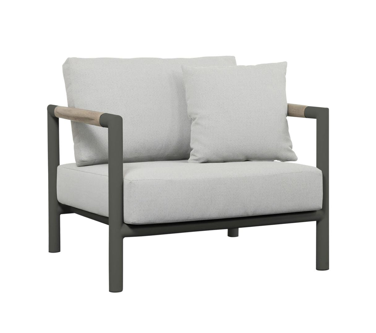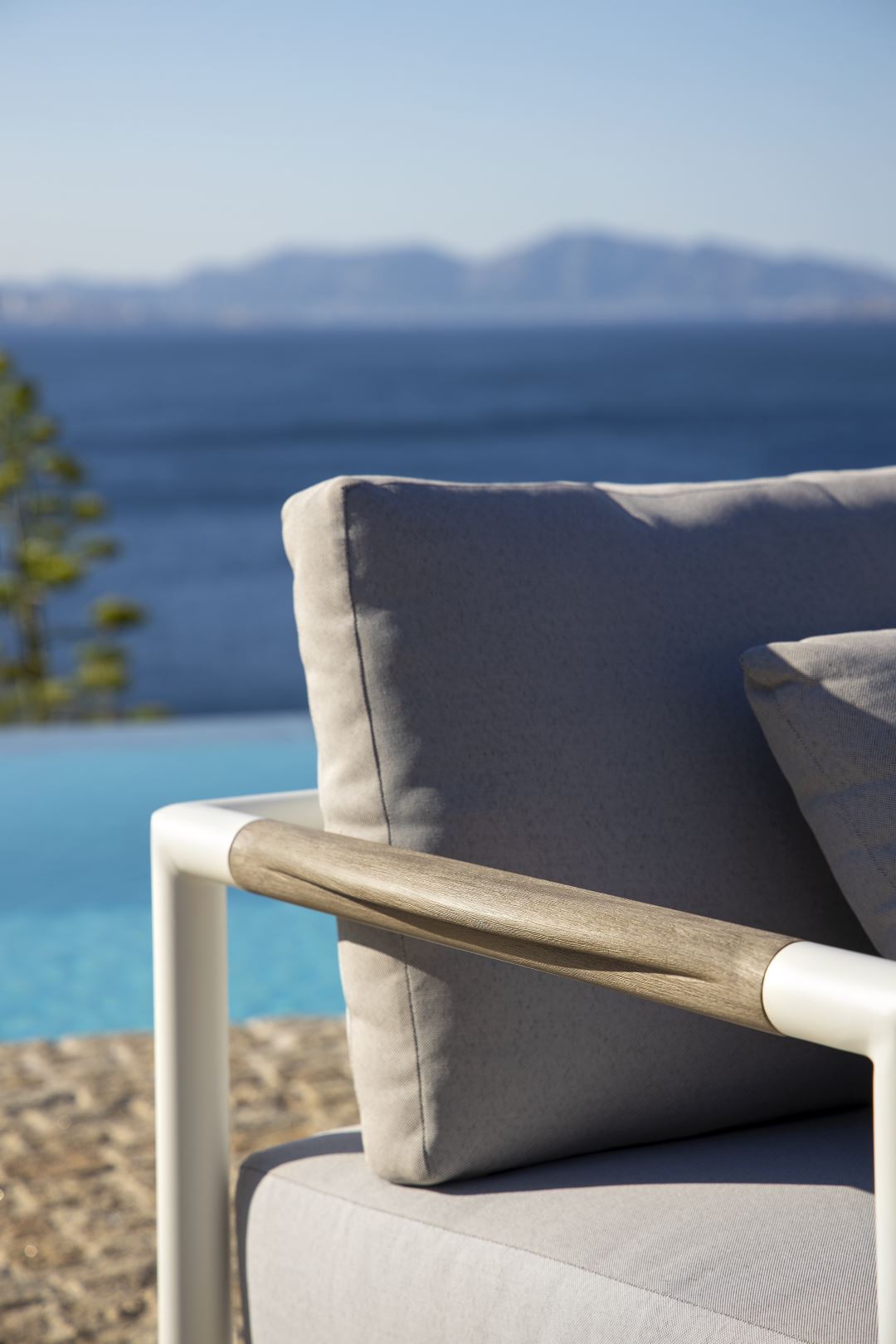 Structure en aluminium (tube de 50mm d'épaisseur) recouvert de peinture poudre polyester cuite au four, accoudoirs en teck à la finition Duratek et coussins Ateja de coloris gris clair. On soulignera le choix d’une belle profondeur d’assise et de coussinage pour assurer un grand confort. Les coussins sont déperlants, déhoussables et sa structure peut rester dehors toute l’année. Très grand confort, coussins déperlants et déhoussables.