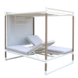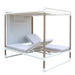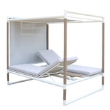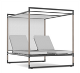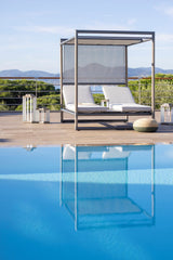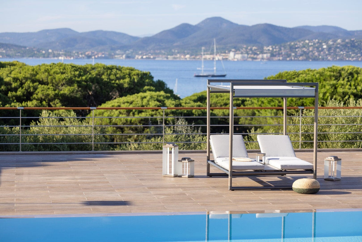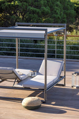 Le summum de la détente en extérieur ! Le kiosque Bastingage est une invitation au farniente… Aluminium, Duratek, coussins Ateja déperlants et déhoussables, les meilleures matières sont de la partie. Les dossiers sont inclinables quelque soit le coté choisi. La partie centrale en HPL sert de table de service. En option, un coussin peut recouvrir cette partie centrale pour offrir une surface coussinée uniforme. La toile Ateja peut quant à elle servir pour se protéger du soleil ou au choix des regards.