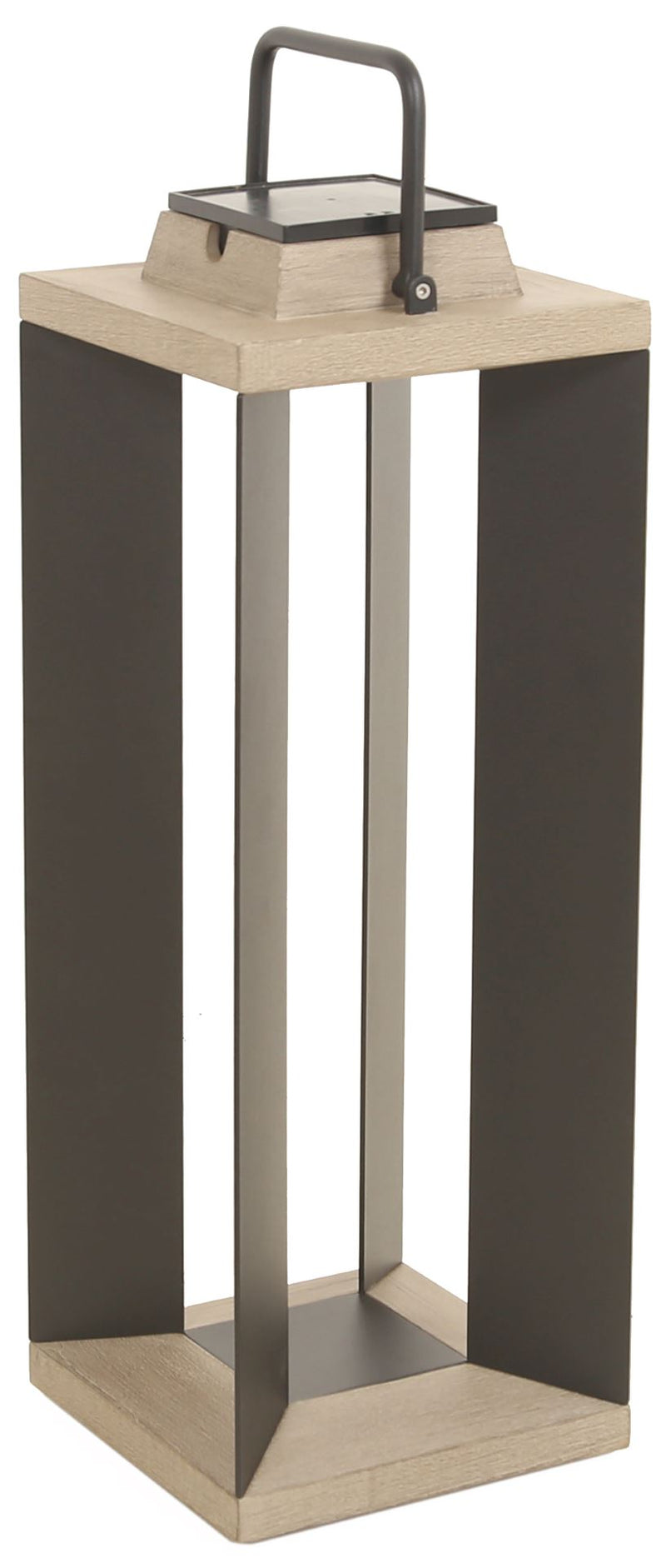 Lanterne solaire et rechargeable 500 lumens Teckalu H65,5cm en Duratek et aluminium noir. D’une élégance rare et de surcroit très éclairante, la trilogie Teckalu fait l’unanimité tant par son design que par son mélange de matière bois/métal orchestré avec finesse. Elle se transporte aisément grâce à sa poignée, elle se pose au sol, sur une terrasse, au bord d’une piscine, sur les marches d’un perron, de part et d’autre d’une entrée. Equipée du module solaire et rechargeable (via port USB), 500 lumens, des plus puissants et fiables du marché, amovible, combinant un panneau solaire à haut rendement, un port micro USB pour recharge secteur, un détecteur de présence (déconnectable), deux batteries lithium et 10 LED dernière génération, elle diffuse une lumière chaude, puissante, d’intensité réglable jusqu’à 500 lumens pendant 5 à 200 heures - Elle se recharge à l’énergie solaire, à la lumière du jour, ou via un câble USB fourni.