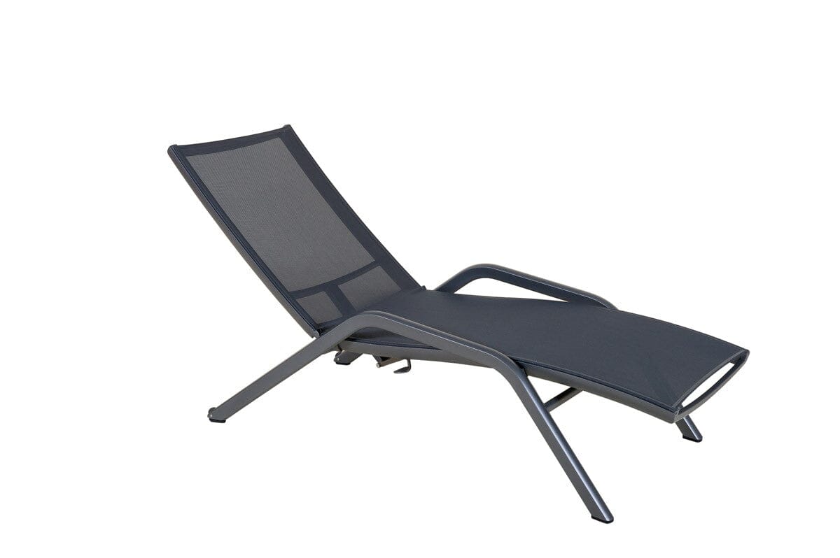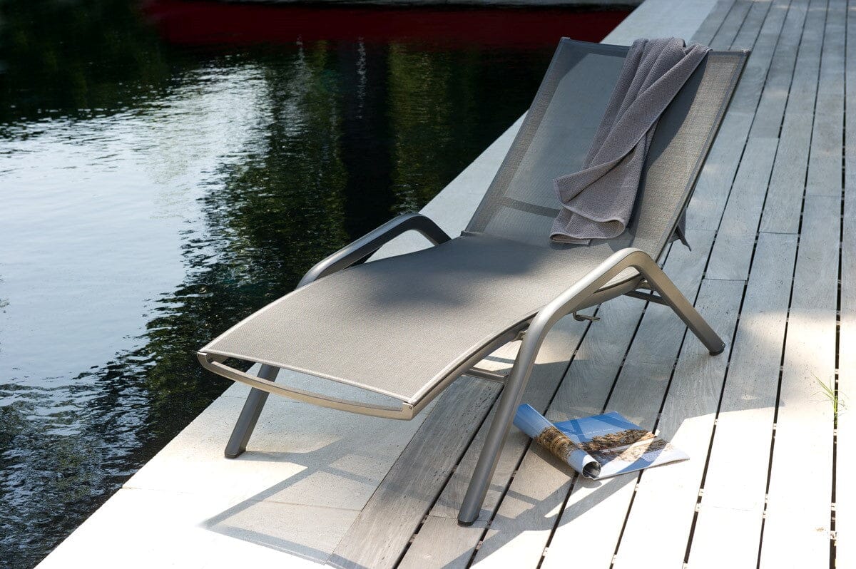 Le bain de soleil Yolo en aluminium et toile batyline est un modèle très pratique: il est équipé de roues arrières et il est empilable. Son système de réglage est ultra rapide et vous permet de régler la hauteur du dossier tout en restant allongé.