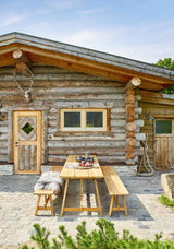 Bois de teck (Tectona Grandis) Provenance Indonésie. Le bois de teck change d'aspect à l'extérieur. A entretenir pour garder sa teinte d'origine ou à laisser se patiner et griser naturellement.